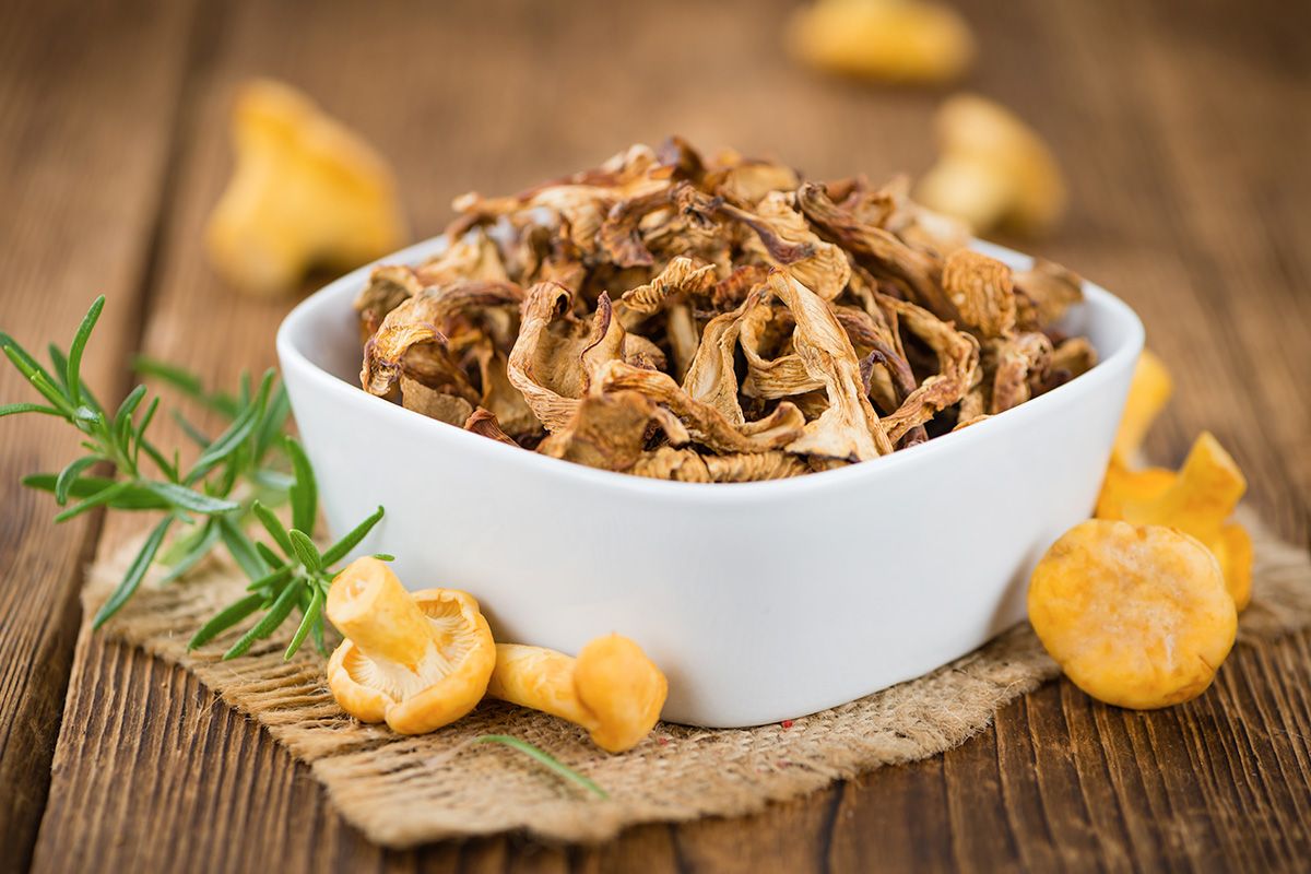 Dried Chanterelles Mushrooms from Bulgaria maintain a firm texture when reconstituded. The cap is wavy and curled, due to the drying method.